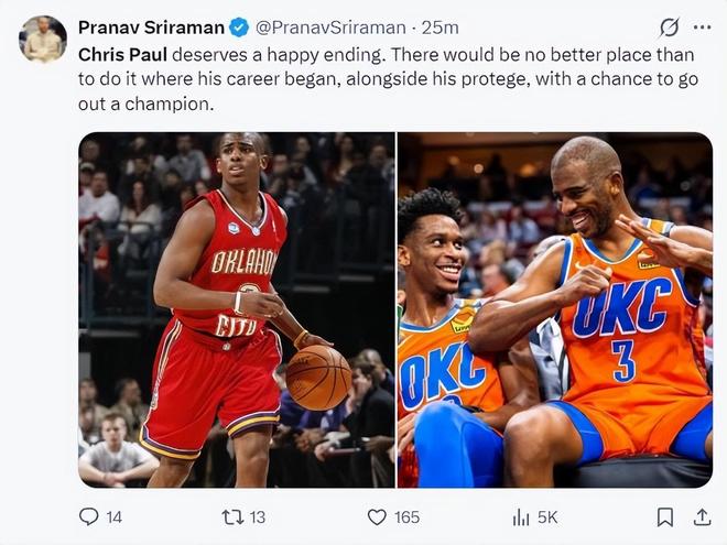 雷霆记者:保罗曾在OKC度过了很美好的赛季,雷霆队本赛季高居联盟第一,我们应该召回保罗让他拿到一枚总冠军戒指退役。